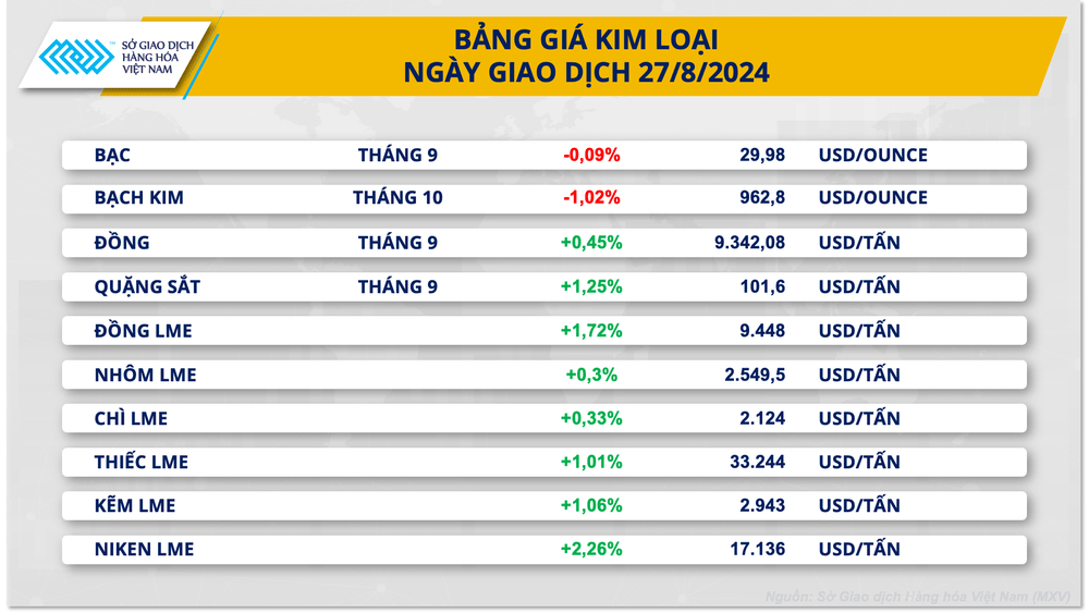 Ngoài ra, giá kim loại như đồng, bạc và bạch kim cũng có xu hướng tăng mạnh trong thời gian gần đây. Giá đồng tăng lên hơn 10.000 USD/tấn, còn giá bạc và bạch kim cũng ghi nhận mức tăng đáng kể, phần lớn nhờ vào kỳ vọng Cục Dự trữ Liên bang Mỹ sẽ cắt giảm lãi suất, làm đồng USD suy yếu và thúc đẩy dòng tiền đổ vào các tài sản kim loại quý.
