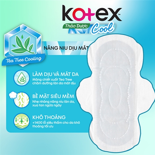 Điểm đặc biệt của Kotex Cool Fresh là công nghệ Max Cool giúp tạo cảm giác mát lạnh, kết hợp với chiết xuất thảo dược tự nhiên như lavender, mang lại sự dịu nhẹ và khử mùi hiệu quả. Sản phẩm còn có thiết kế siêu mỏng, có cánh giúp cố định tốt, chống tràn hiệu quả, rất phù hợp cho những ngày nhạy cảm.