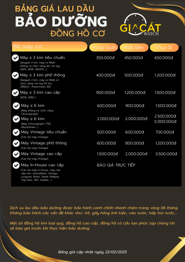 Lau dầu đồng hồ cơ là một trong những công việc bảo dưỡng quan trọng, giúp đồng hồ hoạt động ổn định, kéo dài tuổi thọ và duy trì độ chính xác theo thời gian. Tuy nhiên, không phải ai cũng hiểu rõ về quy trình lau dầu, chi phí thực hiện cũng như lựa chọn dịch vụ uy tín trên thị trường. Bài viết dưới đây sẽ cung cấp cho bạn đầy đủ thông tin về giá lau dầu đồng hồ cơ, bảng giá tham khảo, quy trình thực hiện, lợi ích khi lau dầu định kỳ và những lưu ý quan trọng khi bảo dưỡng đồng hồ, giúp bạn có thêm kiến thức để chăm sóc chiếc đồng hồ của mình hiệu quả nhất.