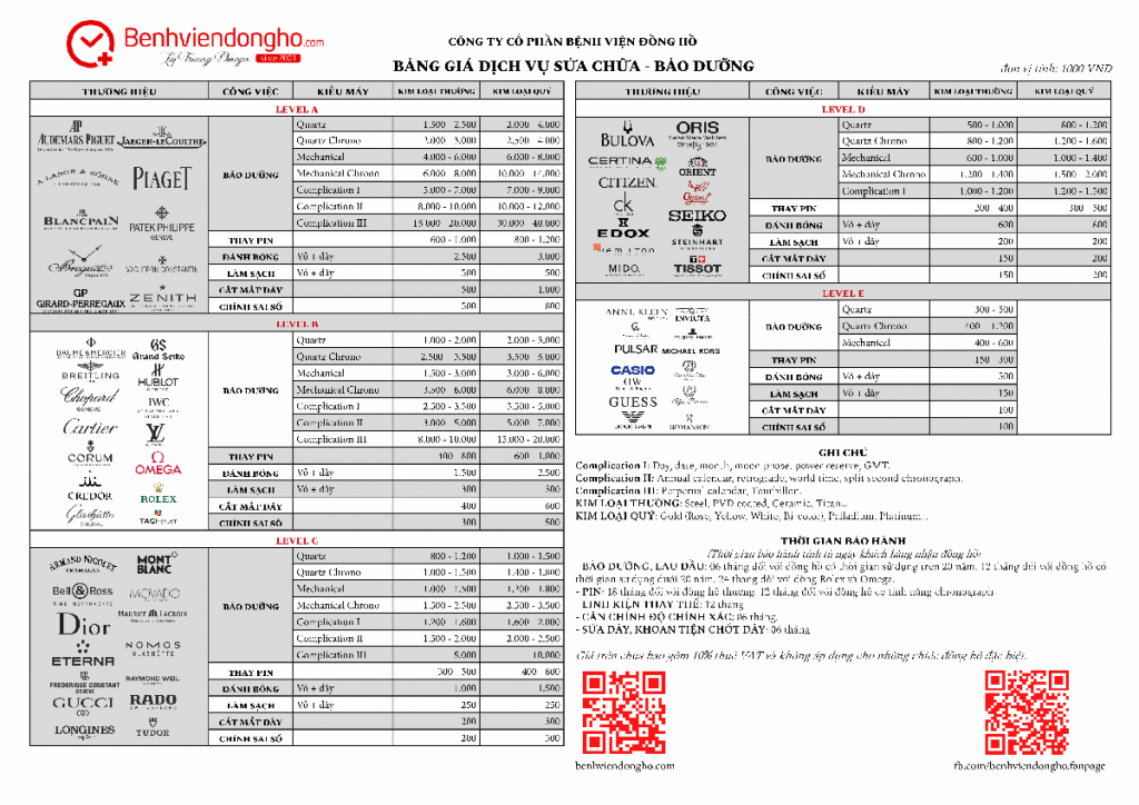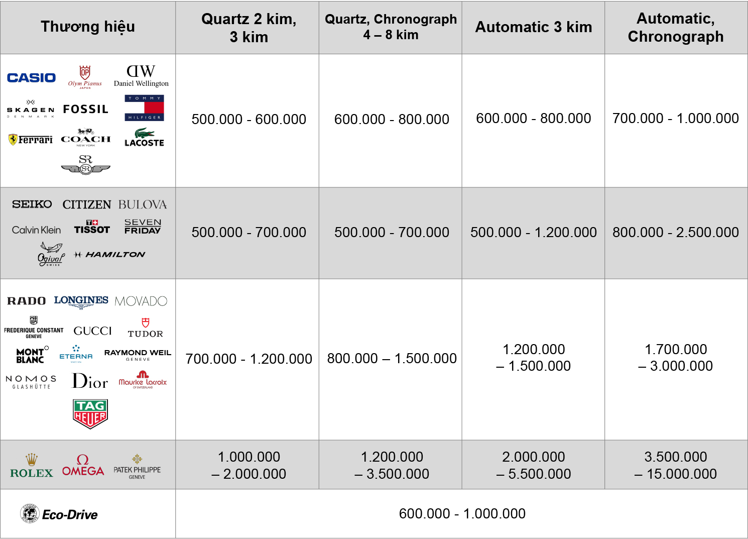Đối với các loại đồng hồ cơ tự động với 3 kim, dịch vụ lau dầu thường có giá từ 350.000 VNĐ đến 750.000 VNĐ, trong khi dòng đồng hồ chronograph (4 – 6 kim) có mức giá rộng hơn, từ 100.000 VNĐ đến 1.800.000 VNĐ. Thời gian bảo hành cho các dịch vụ này thường là 12 tháng và thời gian thực hiện từ 3 đến 5 ngày.