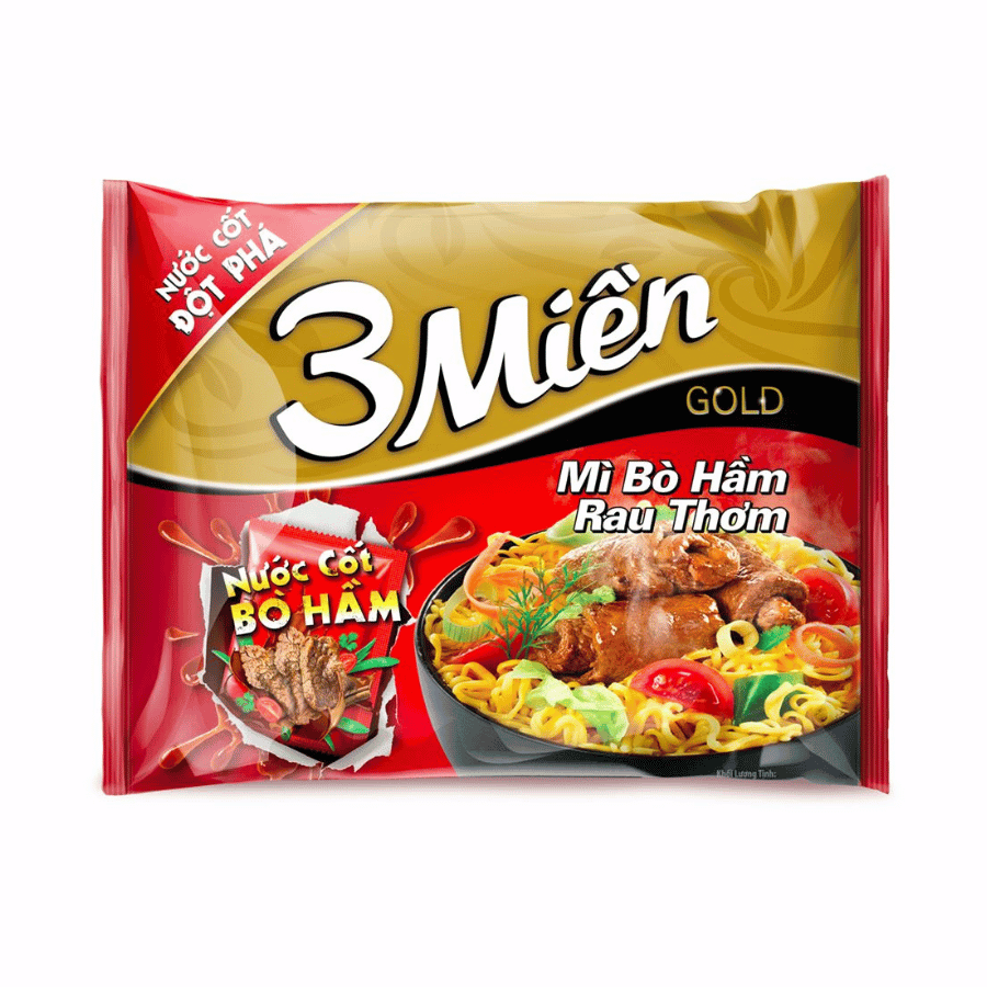 Mì 3 Miền nổi bật với hương vị đậm đà, đặc biệt là dòng Gold với gói nước cốt tôm và thịt hầm kỹ lưỡng, mang lại trải nghiệm thơm ngon, hấp dẫn chỉ trong 3 phút chế biến. Sản phẩm không chỉ tiện lợi mà còn giữ được hương vị truyền thống, phù hợp với khẩu vị người Việt. Đây là lựa chọn phổ biến cho bữa ăn nhanh, vừa túi tiền, lại đảm bảo chất lượng.