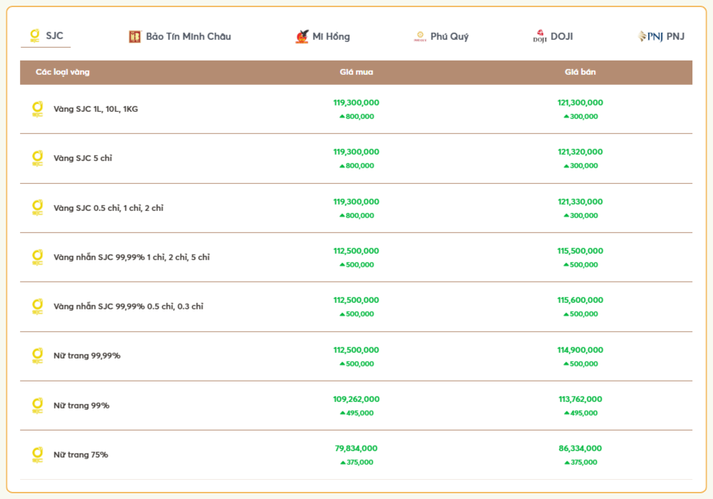 SJC (Saigon Jewelry Company Limited) là thương hiệu vàng uy tín hàng đầu Việt Nam, được thành lập từ năm 1988. SJC nổi bật với vàng miếng chất lượng cao và mạng lưới phân phối rộng khắp gồm hơn 200 cửa hàng và hàng nghìn điểm bán lẻ trên toàn quốc. Bên cạnh SJC, các thương hiệu lớn khác như PNJ và DOJI cũng được đánh giá cao về trang sức tinh xảo và dịch vụ khách hàng.