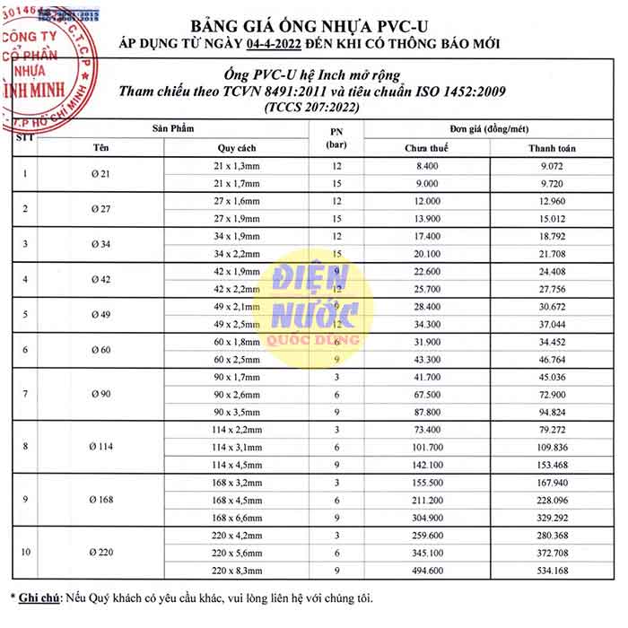 Theo bảng giá mới nhất, ống nhựa PVC 60 x 1.3mm có giá 31,900 VNĐ, trong khi ống 60 x 1.6mm có giá 43,300 VNĐ. Đặc biệt, sản phẩm cũng có nhiều tùy chọn về độ dày khác nhau từ 1.5mm cho đến 4.0mm, phù hợp với nhu cầu đa dạng của người tiêu dùng.