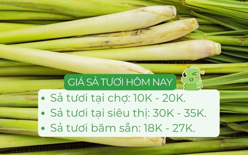 Hiện nay, giá sả tươi trên thị trường đang dao động từ 10.000 – 35.000 đồng/kg, tùy thuộc vào loại sả và địa điểm bán. Thông thường, giá sả tại các chợ sẽ rẻ hơn so với các siêu thị hoặc cửa hàng lớn. Trong những ngày gần đây, giá thu mua sả tại các vườn cũng có sự tăng nhẹ, đạt khoảng 9.500 – 10.200 đồng/kg.