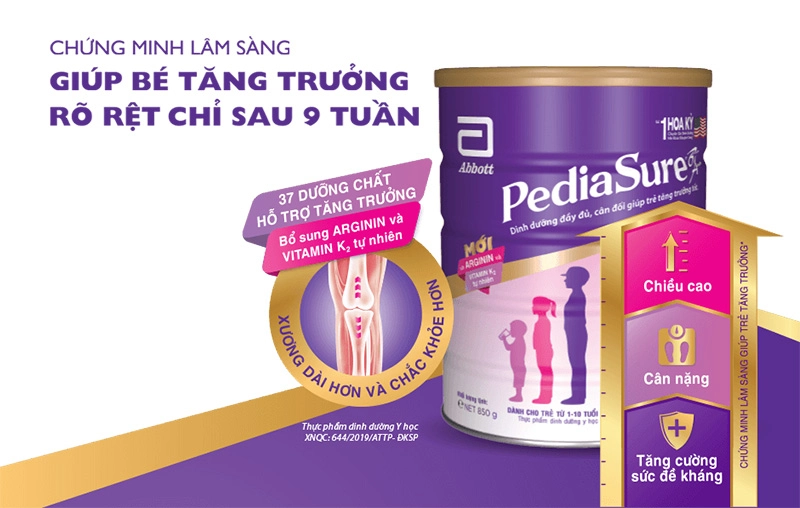 Sữa được sản xuất từ 3 nguồn đạm chất lượng cao và hệ đường kép tiên tiến, giúp trẻ ăn ngon miệng hơn. Ngoài ra, Sữa Pediasure còn chứa canxi và Vitamin D, rất quan trọng cho sự phát triển của xương và cơ. Điều này giúp bé tăng cân và chiều cao một cách tự nhiên.