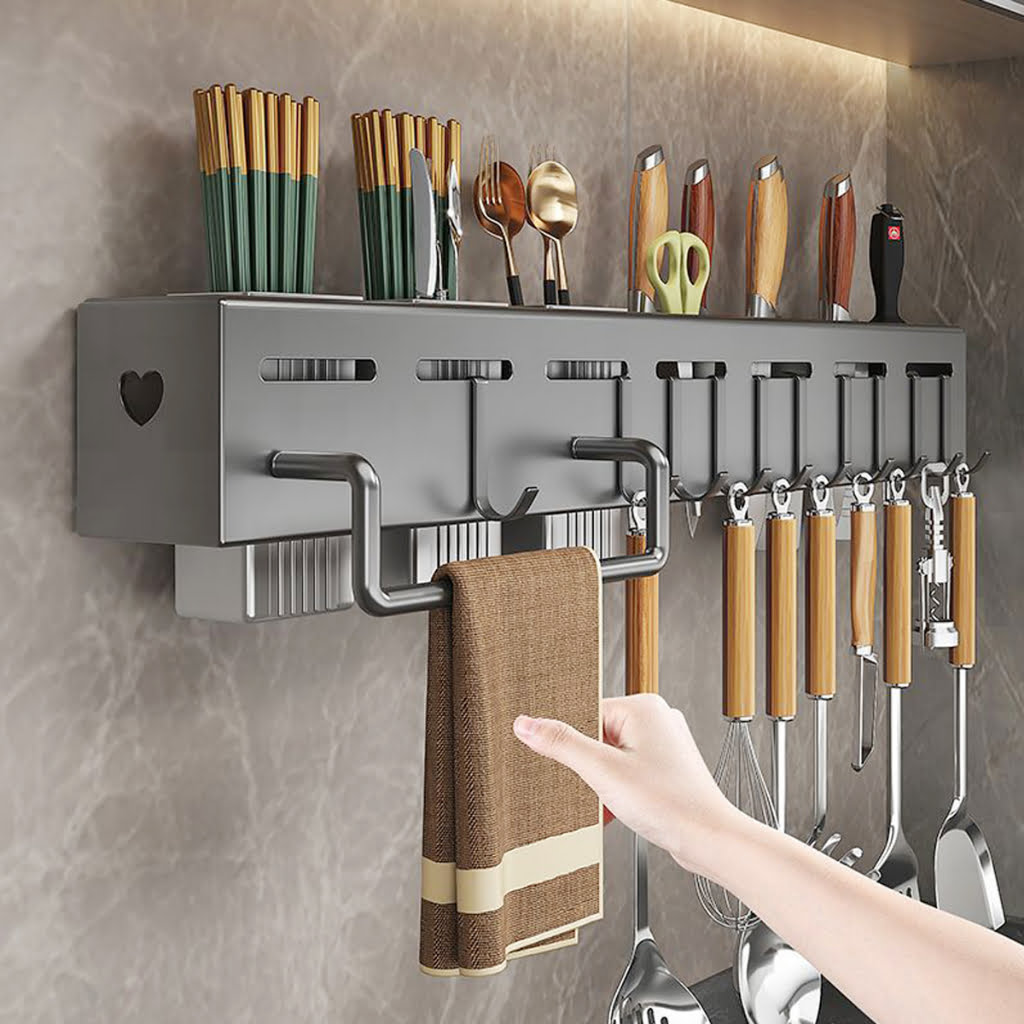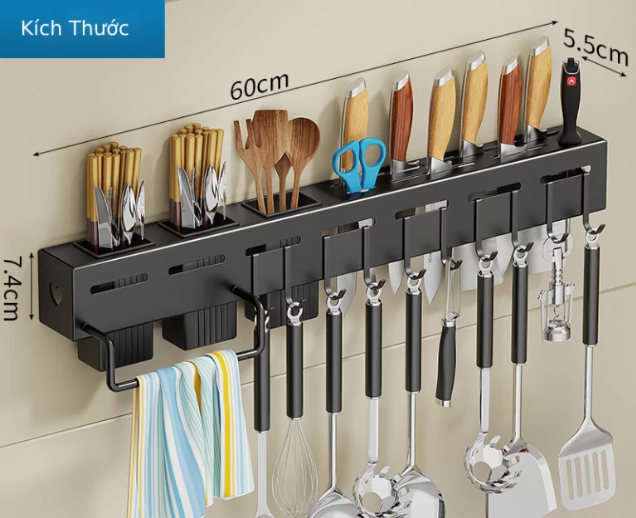 Giá treo đồ nhà bếp đa năng là một giải pháp tuyệt vời cho không gian bếp của bạn. Với thiết kế gọn nhẹ và hiện đại, sản phẩm này không chỉ giúp tiết kiệm diện tích mà còn mang lại sự tiện lợi khi sử dụng. Bạn có thể dễ dàng treo các vật dụng như đũa, muỗng, dao, và các chai gia vị, tạo nên một không gian bếp gọn gàng và ngăn nắp.