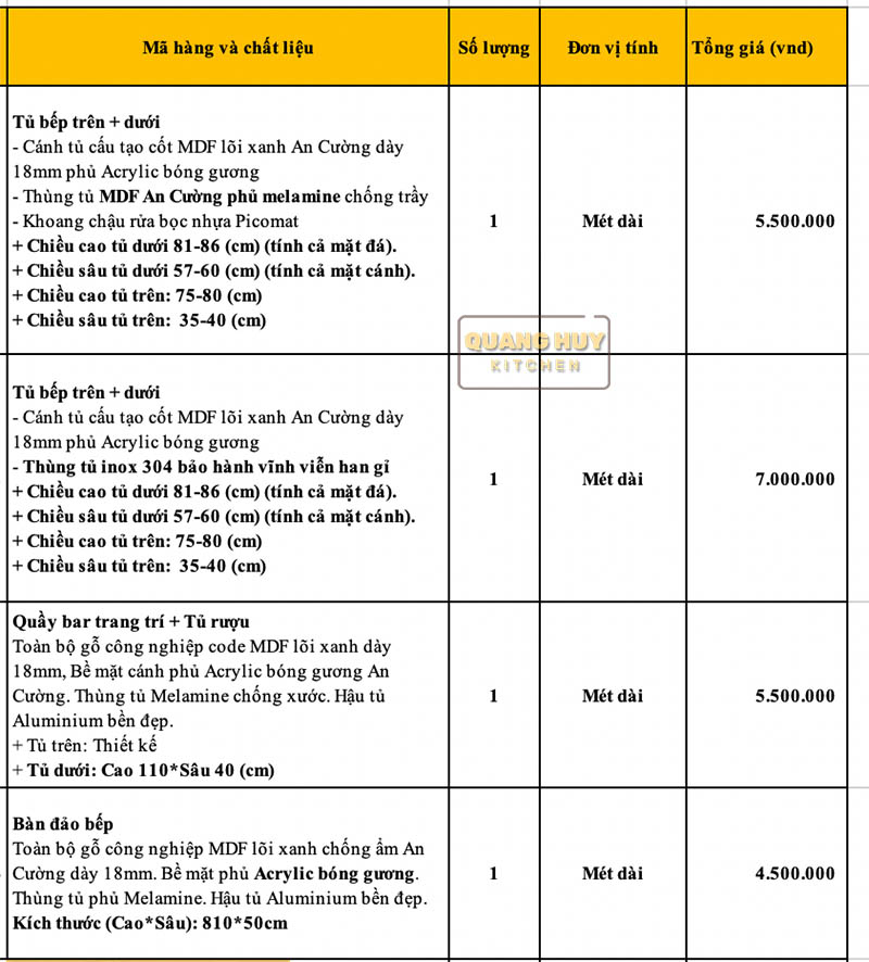 Bên cạnh đó, tủ bếp Acrylic An Cường cũng được biết đến với giá từ 3.800.000 VNĐ đến 4.100.000 VNĐ/mét dài, tùy thuộc vào thiết kế và phụ kiện kèm theo. Với nhiều mẫu mã đa dạng, tủ bếp Acrylic bóng gương hứa hẹn sẽ là lựa chọn lý tưởng cho không gian bếp hiện đại.