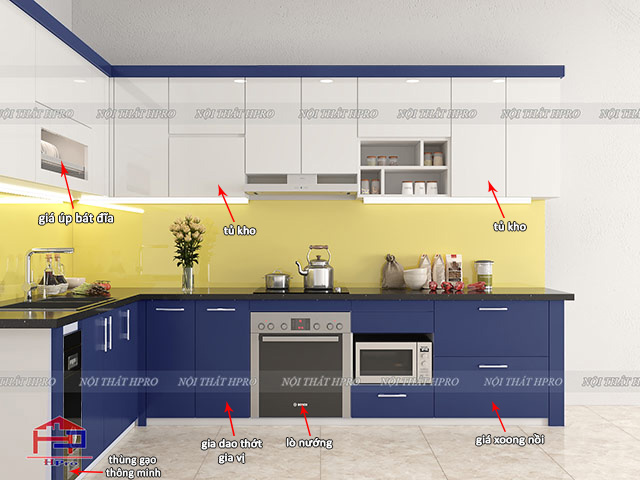 Bề mặt bóng gương không chỉ mang lại vẻ đẹp thẩm mỹ cho không gian mà còn chống trầy xước và dễ dàng vệ sinh. Đồng thời, tủ bếp còn được thiết kế với các phụ kiện thông minh, giúp tối ưu hóa không gian sử dụng, từ giá úp bát đĩa đến thùng gạo, tạo nên sự tiện nghi tuyệt đối cho gian bếp của bạn.