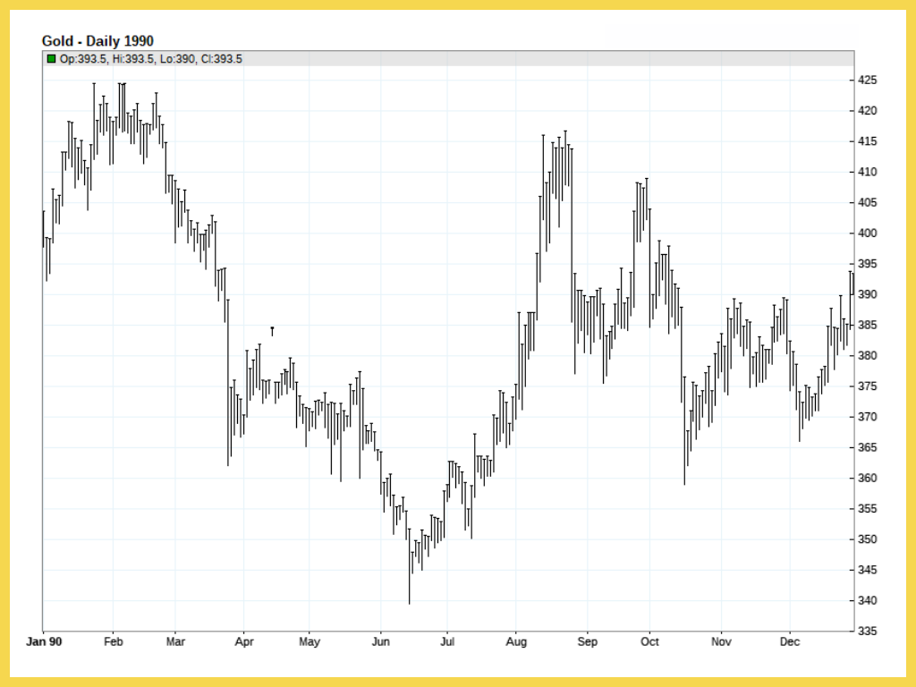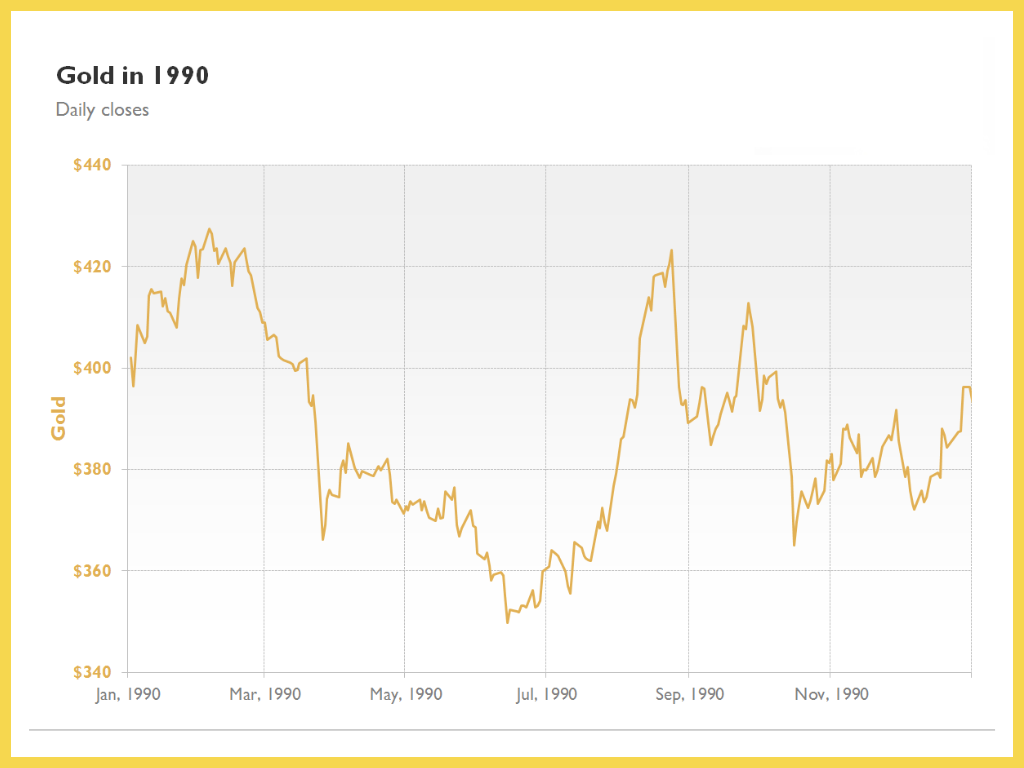 Nguyên nhân chính khiến giá vàng biến động trong năm 1990 là do cuộc xung đột Kuwait-Iraq vào tháng 8, gây ra khủng hoảng chính trị và kinh tế toàn cầu, đặc biệt ảnh hưởng đến nguồn cung dầu mỏ. Tình hình này làm tăng nhu cầu mua vàng như một tài sản an toàn, đẩy giá vàng lên cao. Bên cạnh đó, lạm phát và sự mất giá của đồng đô la Mỹ cũng góp phần làm giá vàng tăng do nhu cầu trú ẩn tài sản tăng cao.