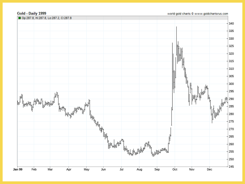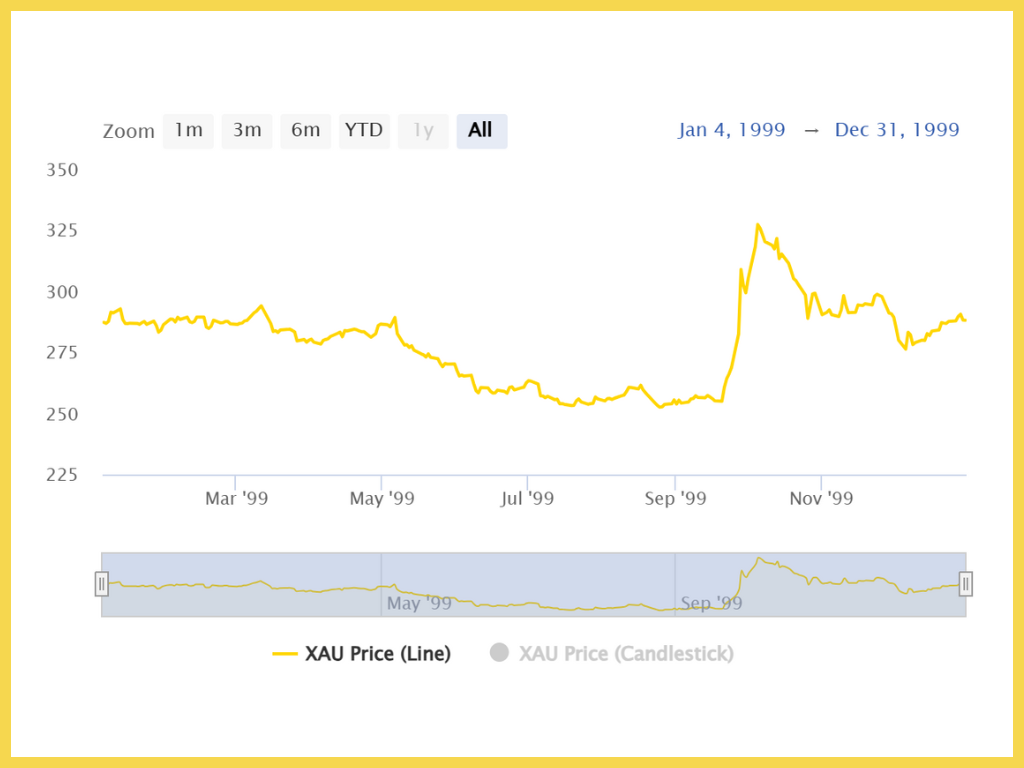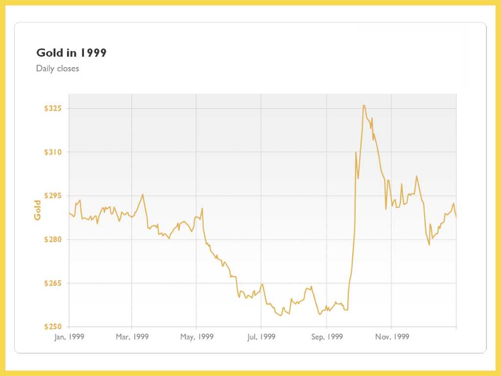 So với năm 1998, giá vàng tại Việt Nam không có sự thay đổi lớn. Tuy nhiên, trên thị trường quốc tế, giá vàng năm 1999 có những biến động đáng kể. Vào tháng 8 năm 1999, giá vàng thế giới đã giảm xuống mức thấp nhất là 251,95 USD/ounce. Sự giảm này ảnh hưởng đến tâm lý thị trường nhưng không làm thay đổi nhiều giá vàng tại Việt Nam.