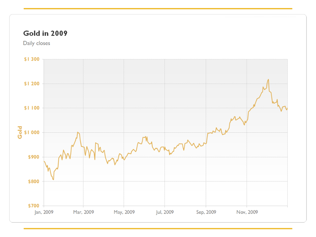 Ngoài ra, giá vàng trong năm 2009 đã thiết lập nhiều kỷ lục mới, với mức giá đóng cửa cao nhất trên thị trường thế giới đạt 1.215,8 USD/oz vào tháng 12, cho thấy sức hút mạnh mẽ của vàng như một kênh trú ẩn an toàn trong bối cảnh kinh tế còn nhiều biến động và lo ngại về lạm phát, suy thoái kinh tế toàn cầu vẫn hiện hữu.
