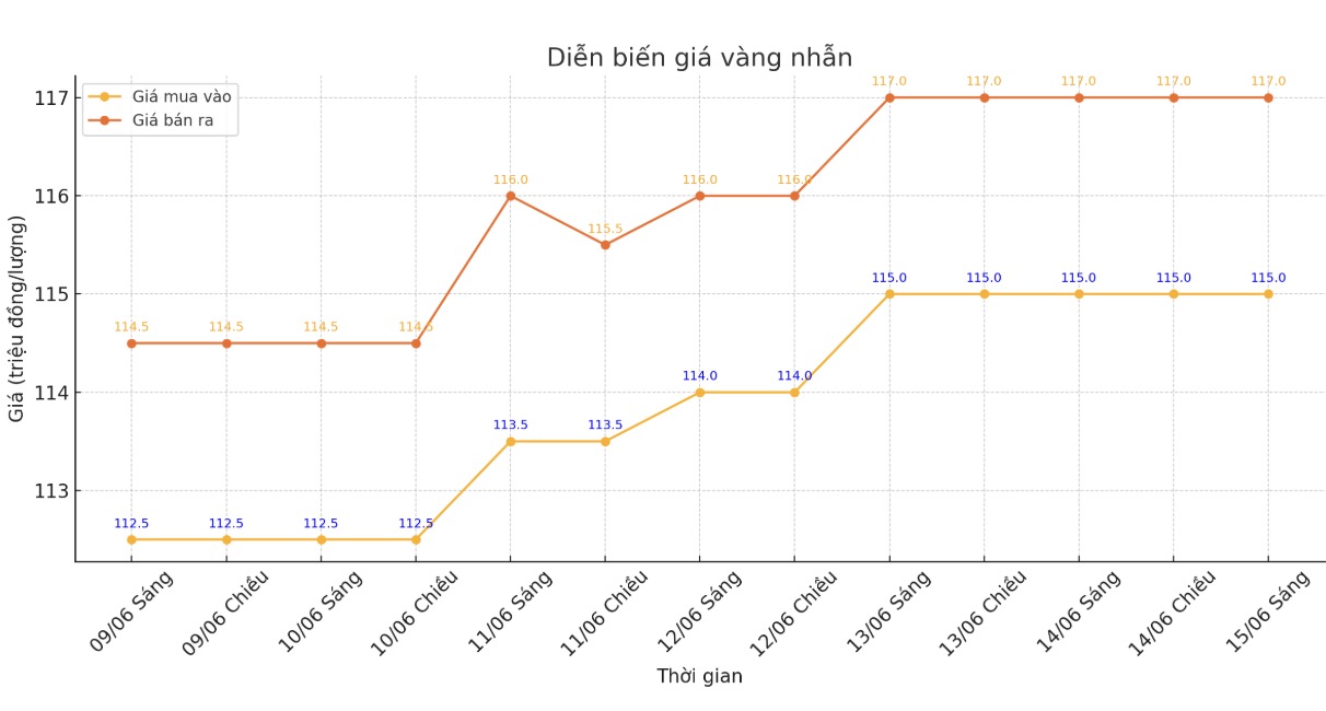 Vàng nhẫn 9999 cũng có sự điều chỉnh nhẹ, dao động trong khoảng 115,6 đến 118,1 triệu đồng/lượng tùy thương hiệu. Mức chênh lệch giá mua – bán vàng miếng SJC hiện phổ biến khoảng 2 triệu đồng/lượng, cho thấy thị trường vẫn khá ổn định và không có biến động mạnh gây sốt giá.