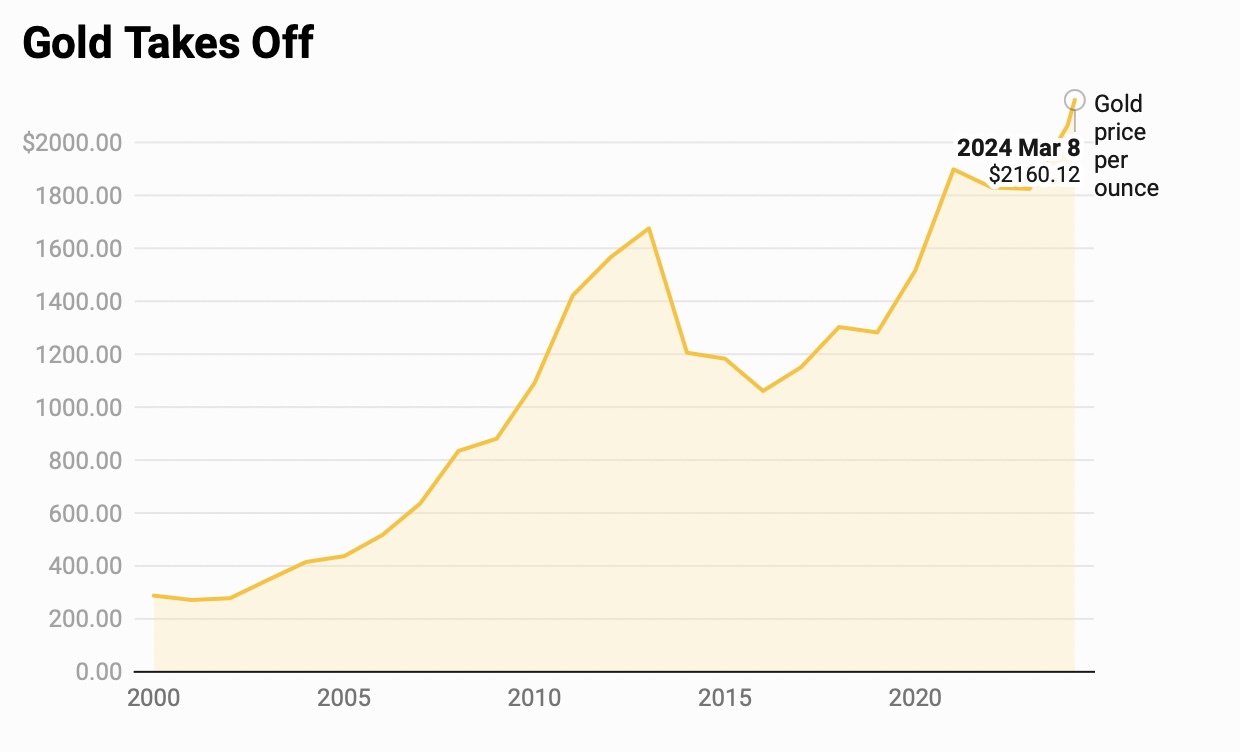 Giá vàng qua các năm luôn thể hiện sự biến động mạnh mẽ, phản ánh nhiều yếu tố kinh tế, chính trị và xã hội trên thế giới. Từ năm 2000 đến 2010, giá vàng liên tục tăng, tiếp tục duy trì đà tăng đến năm 2013 trước khi giảm trong giai đoạn 2013-2015. Từ 2016 đến 2018, giá vàng ổn định hơn, nhưng lại tăng đột biến trong giai đoạn 2019-2022 do ảnh hưởng của dịch bệnh và bất ổn địa chính trị toàn cầu.