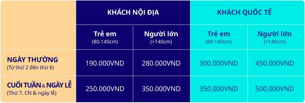 Vé vào cửa cho người lớn trong tuần chỉ 280.000 VNĐ và 250.000 VNĐ cho trẻ em cao từ 80-140 cm. Cuối tuần và ngày lễ, giá vé sẽ cao hơn một chút, với giá 350.000 VNĐ cho người lớn và 250.000 VNĐ cho trẻ em. Đặc biệt, trẻ em dưới 80 cm được miễn phí vào cửa – đây là cơ hội tuyệt vời để cả gia đình cùng đi chơi!