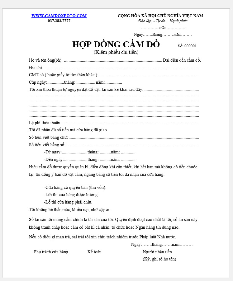 Mỗi tiệm cầm đồ có thể sử dụng mẫu hợp đồng khác nhau, nhưng một mẫu hợp đồng cơ bản thường bao gồm tên tài sản cầm cố, đặc điểm của xe máy, số tiền cầm và các điều kiện liên quan. Điều này giúp hạn chế tranh chấp và đảm bảo sự minh bạch giữa các bên liên quan.