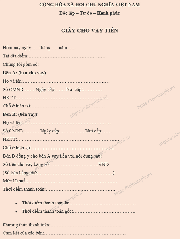 Mẫu giấy vay tiền cá nhân là một tài liệu cần thiết trong các giao dịch vay mượn, giúp bảo vệ quyền lợi của cả bên cho vay và bên vay. Một mẫu giấy vay tiền đơn giản, ngắn gọn nên bao gồm các thông tin cơ bản như họ tên đầy đủ, số CMND/CCCD, địa chỉ thường trú, số tiền vay, và thời hạn trả nợ. Ví dụ, bên B đồng ý cho bên A vay 100.000.000 VND (Một trăm triệu đồng Việt Nam) với các điều khoản rõ ràng.