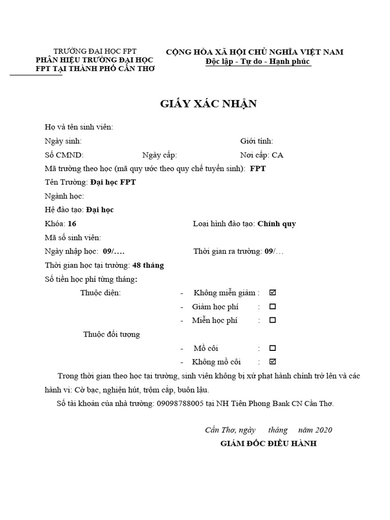 Mẫu đơn xin vay vốn sinh viên mới nhất thường là giấy xác nhận do nhà trường cấp, dùng để vay vốn ngân hàng hoặc vay vốn địa phương. Giấy này ghi rõ thông tin sinh viên như họ tên, ngày tháng năm sinh, số CMND/CCCD, cùng tên trường và mã trường để thuận tiện xác minh.