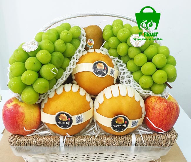 Một trong những lựa chọn phù hợp là giỏ hoa quả giá chỉ từ 315.000 đồng, gồm các loại trái cây tươi ngon như táo Pink, nho đỏ và quýt Úc. Điều đặc biệt là mỗi giỏ đều được chọn lọc kỹ lưỡng từ 100% trái cây tươi nhập khẩu, không chỉ đảm bảo về chất lượng mà còn đẹp mắt, hấp dẫn.