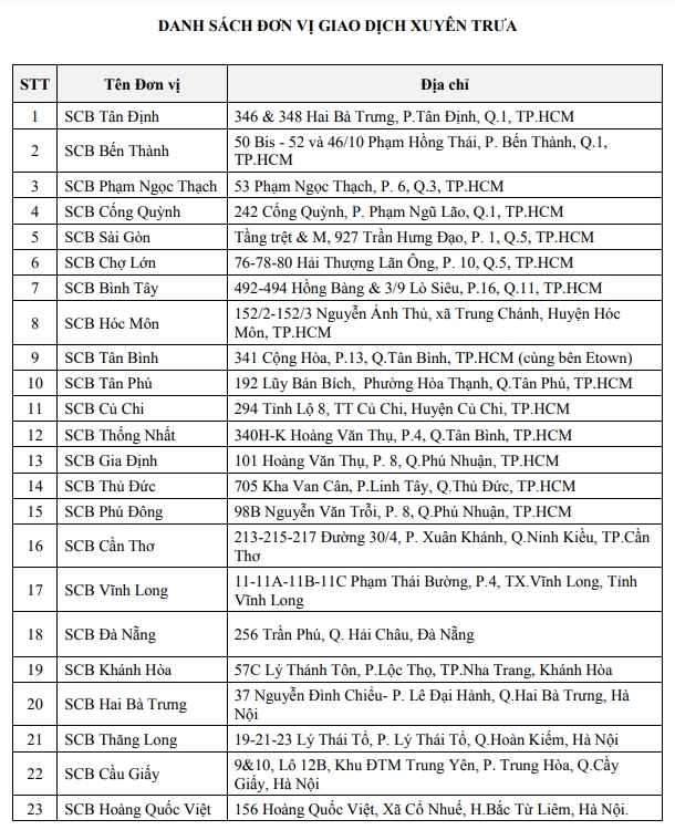 Đáng chú ý, SCB cũng đang tiến hành cơ cấu lại hệ thống, yêu cầu hoàn thiện trước ngày 15-9. Việc đóng cửa một số phòng giao dịch tại Hà Nội cho thấy ngân hàng đang nỗ lực tối ưu hóa quy trình làm việc để phục vụ khách hàng tốt nhất có thể. Các thông tin về tỷ giá hối đoái ngoại tệ và các dịch vụ khác cũng được SCB cập nhật thường xuyên, giúp khách hàng nắm bắt kịp thời tình hình tài chính.