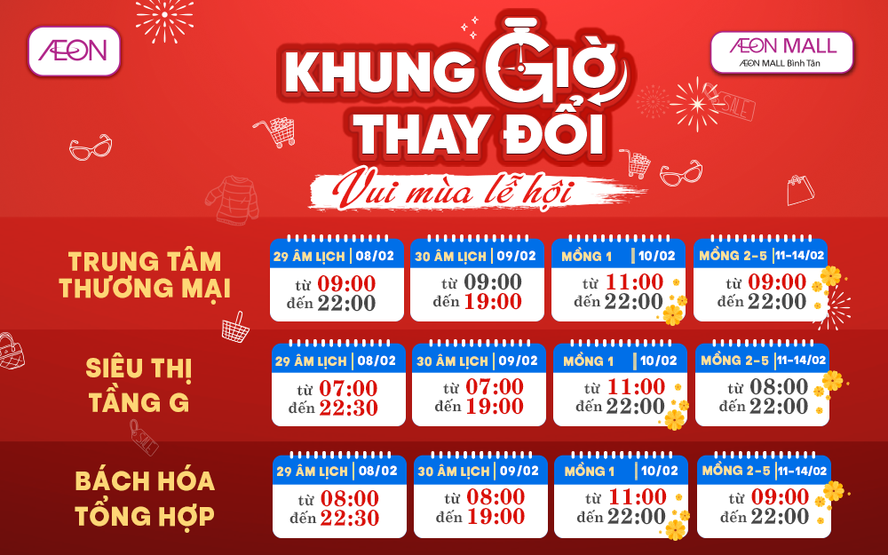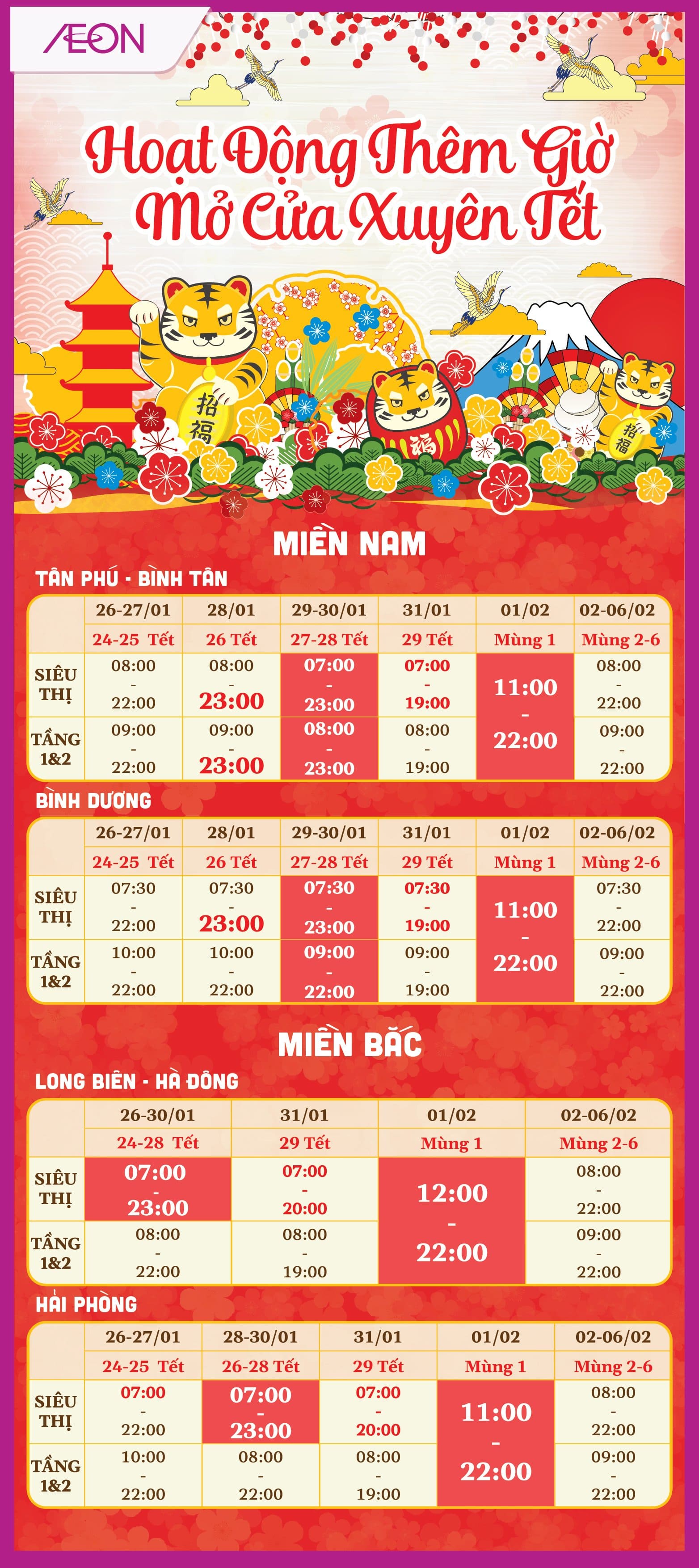 Siêu thị AEON hoạt động với lịch trình linh hoạt, tùy thuộc vào địa điểm và ngày trong tuần. Tại AEON MALL Hải Phòng Lê Chân, siêu thị mở cửa từ 8:00 đến 22:00 vào các ngày thường, trong khi vào cuối tuần và ngày lễ, giờ mở cửa là từ 9:00 đến 22:00. Tương tự, AEON MALL Long Biên mở cửa hàng ngày từ 9:00 đến 22:00. Tại AEON MALL Huế, siêu thị hoạt động từ 8:00 đến 22:00 trên tầng 1, còn các tầng khác mở cửa từ 10:00 đến 22:00. Đặc biệt trong dịp Tết, AEON có sự điều chỉnh giờ hoạt động, thường mở cửa sớm và đóng cửa muộn hơn để phục vụ khách hàng tốt hơn.
