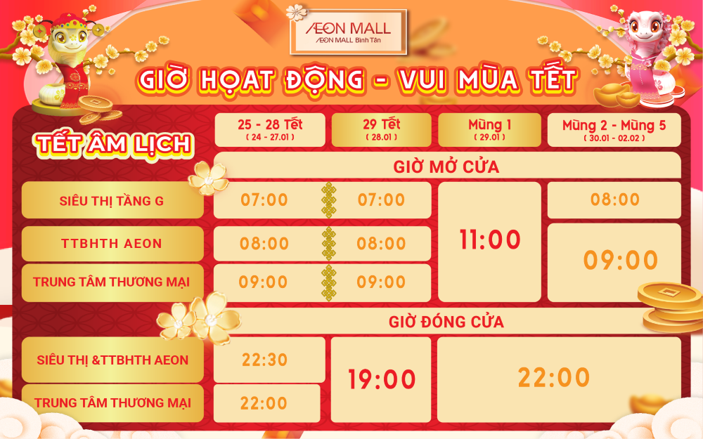 AEON Mall Bình Tân thiết lập giờ mở cửa linh hoạt để phục vụ nhu cầu của khách hàng. Trong những ngày thường từ thứ Hai đến thứ Sáu, trung tâm thương mại hoạt động từ 10:00 đến 22:00. Vào các ngày thứ Bảy, Chủ nhật và những dịp lễ, giờ mở cửa được điều chỉnh sớm hơn, bắt đầu từ 9:00 và kéo dài đến 22:00. Siêu thị AEON bên trong trung tâm cũng có giờ hoạt động riêng biệt, mở cửa từ 8:00 đến 22:00 hàng ngày. Khách hàng nên chú ý rằng giờ mở cửa có thể thay đổi trong các dịp lễ đặc biệt, vì vậy hãy kiểm tra thông tin cập nhật trước khi đến thăm.