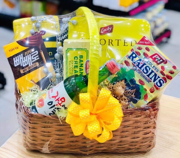 Không gian Tết sẽ thêm phần ấm áp với những giỏ quà tinh tế, chứa đựng những món ăn ngon như bánh kẹo, nước ngọt, và các đặc sản nổi tiếng. Đây chắc chắn là món quà gửi gắm yêu thương và lòng biết ơn, biểu tượng cho sự an khang, thịnh vượng trong năm mới.