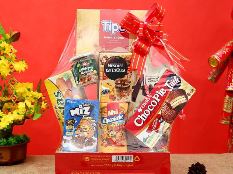 Giỏ quà Tết không chỉ đơn thuần là đồ ăn mà còn là sự tinh tế trong lựa chọn các sản phẩm như bánh quy Leibniz, nước giải khát vị dưa hấu hay snack khoai tây. Những món ăn này không chỉ ngon miệng mà còn mang đậm màu sắc ngày Tết, giúp không khí xuân thêm phần rộn ràng.