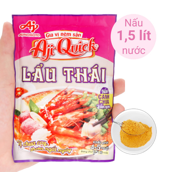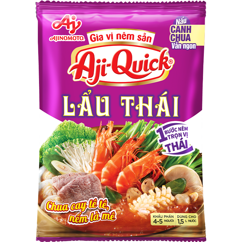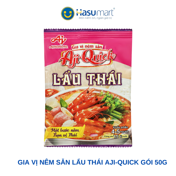 Nếu bạn đang tìm kiếm nguyên liệu để chuẩn bị một nồi lẩu Thái ngon miệng, thì có thể tham khảo dòng gia vị nêm sẵn Aji-Quick. Gói gia vị chỉ nặng 50g nhưng chứa đầy đủ các thành phần cần thiết như muối, đường, ớt, và hương liệu đặc trưng, giúp món ăn của bạn trở nên thơm ngon và đậm đà.