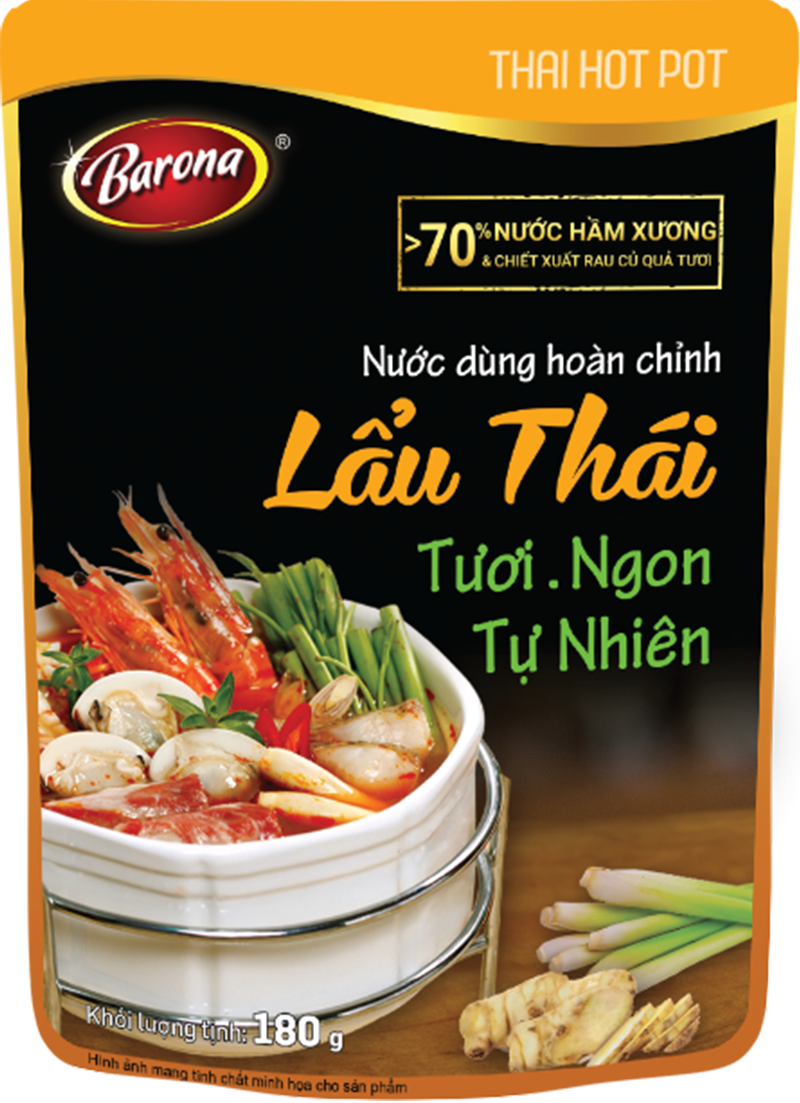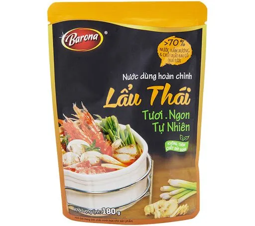 Tuy nhiên, gói nước lẩu này được quảng cáo là không có chất bảo quản và chất tạo màu, sử dụng nguyên liệu tự nhiên, cùng nước cốt hầm xương và công thức gốc từ Thái Lan. Điều này khiến mình cảm thấy yên tâm hơn về chất lượng sản phẩm. Thêm vào đó, gói nước lẩu Thái Barona 180g mang đến trải nghiệm tiện lợi khi không cần nêm nếm thêm gia vị gì khác.