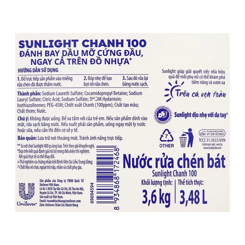 Nước rửa chén Sunlight có hạn sử dụng khoảng 3 năm kể từ ngày sản xuất. Đây là thông tin chung áp dụng cho nhiều dòng sản phẩm Sunlight như Sunlight thiên nhiên lô hội, Sunlight trà xanh, Sunlight chanh, và Sunlight quế bồ hòn. Để đảm bảo chất lượng và hiệu quả làm sạch, bạn nên lưu ý bảo quản sản phẩm ở nơi khô ráo, thoáng mát, tránh ánh nắng mặt trời trực tiếp và nhiệt độ cao.