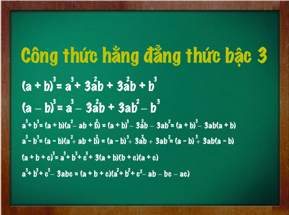 Một trong những công thức nổi bật của hằng đẳng thức bậc 3 là lập phương của một tổng: \( (A + B)^3 = A^3 + 3A^2B + 3AB^2 + B^3 \) và lập phương của một hiệu: \( (A – B)^3 = A^3 – 3A^2B + 3AB^2 – B^3 \). Những công thức này không chỉ đơn giản hóa việc tính toán mà còn giúp chúng ta nhận diện và áp dụng chúng trong các bài toán thực tế.