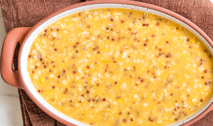Một món ăn ngon và bổ dưỡng có thể kể đến là cháo hạt diêm mạch kết hợp với thịt heo và bí đỏ. Chỉ cần chuẩn bị một chén cháo tươi, 1 muỗng hạt diêm mạch, 30g thịt heo xay và một khúc bí đỏ nhỏ khoảng 20g, là bạn đã có ngay một món ăn dặm hấp dẫn cho bé yêu.
