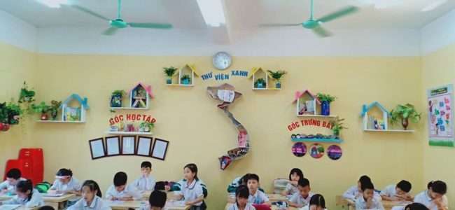 Không gian lớp học còn được trang trí bằng các câu khẩu hiệu, bảng điểm thi đua hay hoa điểm mười để khích lệ tinh thần học tập của học sinh. Tất cả tạo nên một môi trường học tập vừa vui nhộn, vừa truyền cảm hứng, giúp các em nhỏ thêm yêu trường, yêu lớp và hứng thú với mỗi giờ học. Đây thực sự là một không gian ấm áp, gần gũi, nơi các bé có thể phát triển cả về kiến thức lẫn tình cảm.