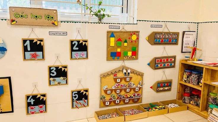 Ngoài ra, lớp học còn được bố trí các góc học tập riêng biệt như góc đọc sách với giá sách nhỏ xinh, góc thiên nhiên với những chậu cây xanh tươi mát, tạo cảm giác gần gũi với thiên nhiên và giúp không khí trong lành hơn. Những vật liệu trang trí thường là giấy màu, tranh ảnh, rèm cửa nhẹ nhàng, thậm chí là vật liệu tái chế thân thiện với môi trường, vừa đẹp vừa có ý nghĩa giáo dục.