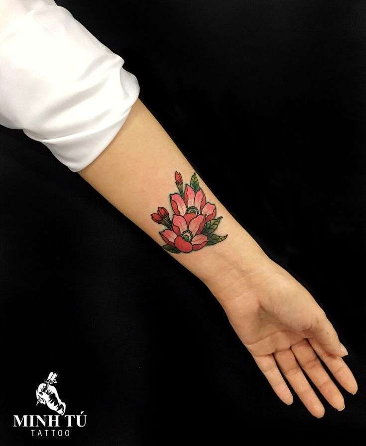 Vị trí tay rất phù hợp để phô diễn hình xăm hoa mẫu đơn mini bởi nó dễ nhìn, lại tạo điểm nhấn thanh lịch, không quá phô trương. Nhiều bạn nữ chọn xăm ở cổ tay hoặc phía dưới cánh tay, nơi vừa kín đáo vừa dễ khoe khi cần. Màu sắc của hình xăm cũng rất đa dạng, từ đỏ tượng trưng cho may mắn, trắng thuần khiết đến tím quyền lực hay vàng rực rỡ, mỗi màu mang một thông điệp riêng biệt.