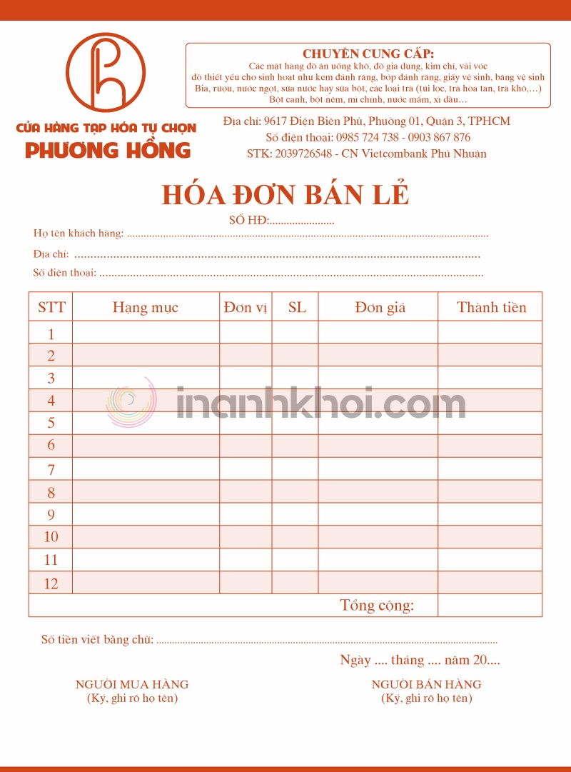 Hóa đơn bán lẻ tạp hóa là một chứng từ rất quan trọng cho các cửa hàng và hộ kinh doanh nhỏ lẻ. Khi khách hàng thực hiện giao dịch mua hàng, hóa đơn này sẽ được xuất ra để ghi nhận thông tin chi tiết về sản phẩm mà họ đã mua. Điều này không chỉ giúp người bán quản lý số lượng hàng hóa mà còn hỗ trợ người mua biết rõ hơn về các giao dịch của mình.