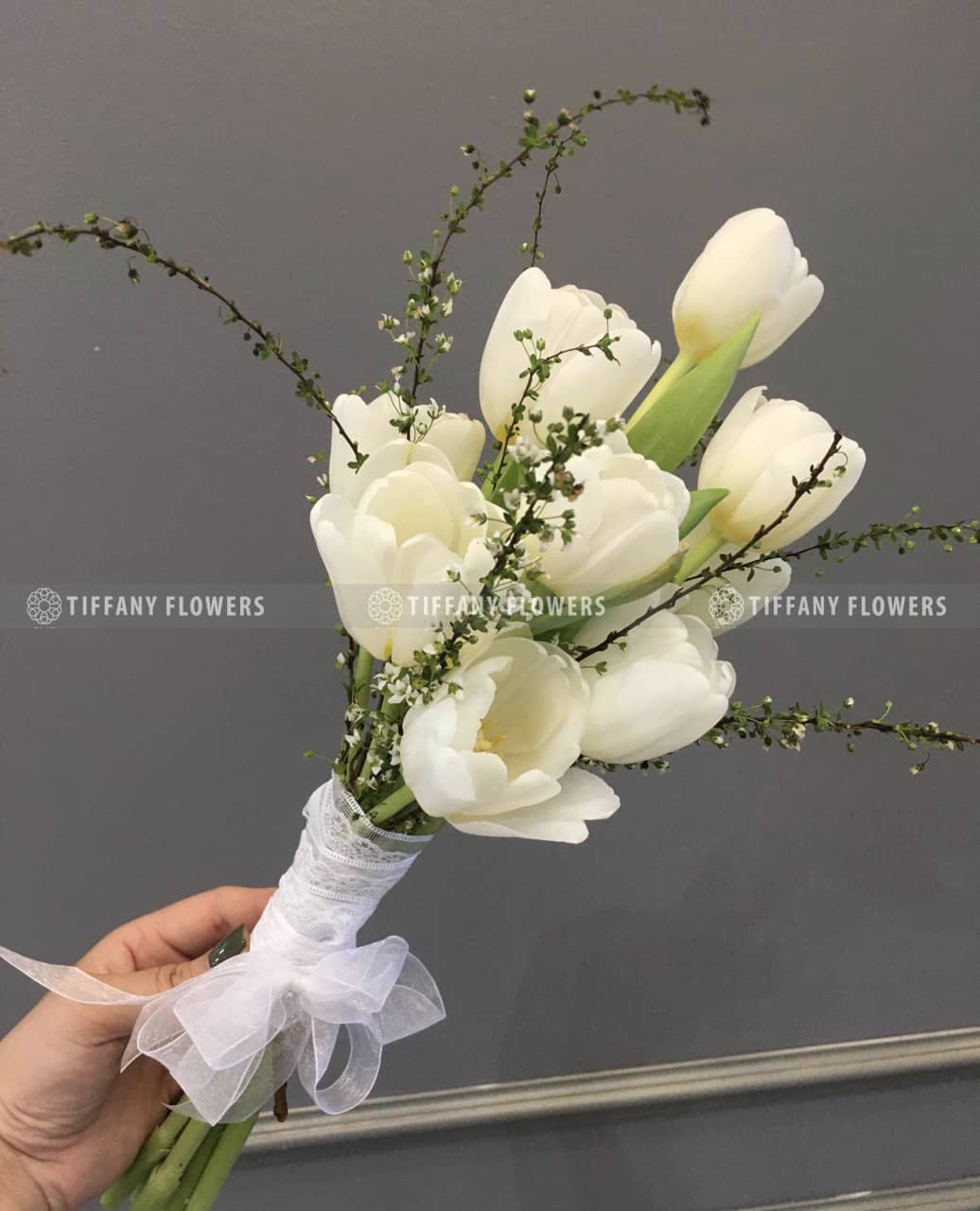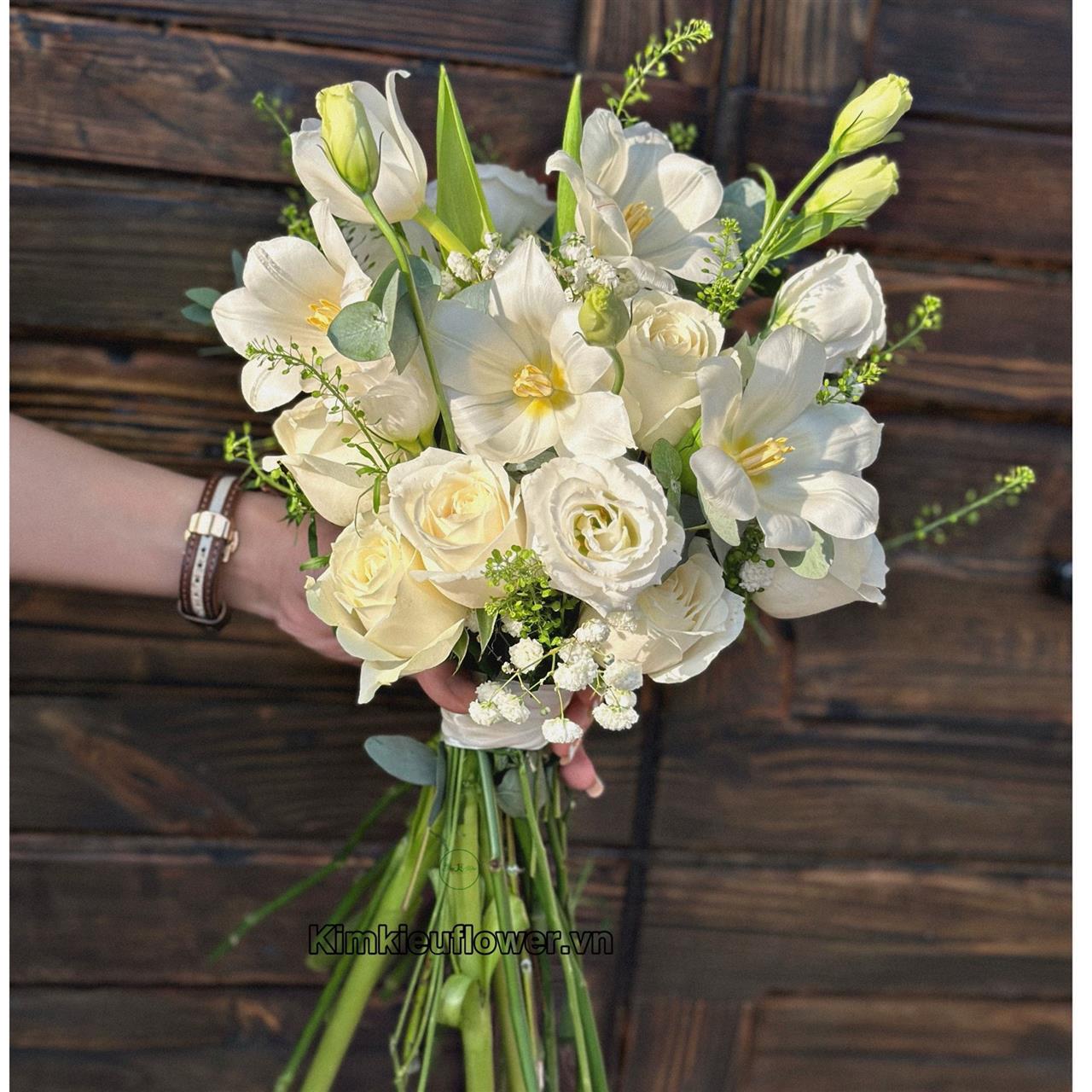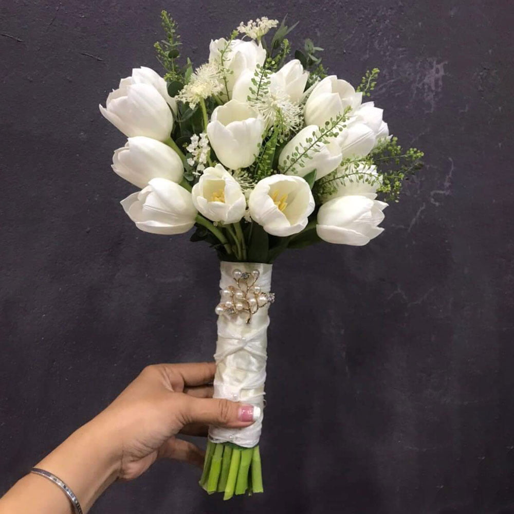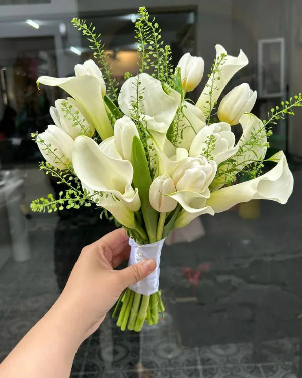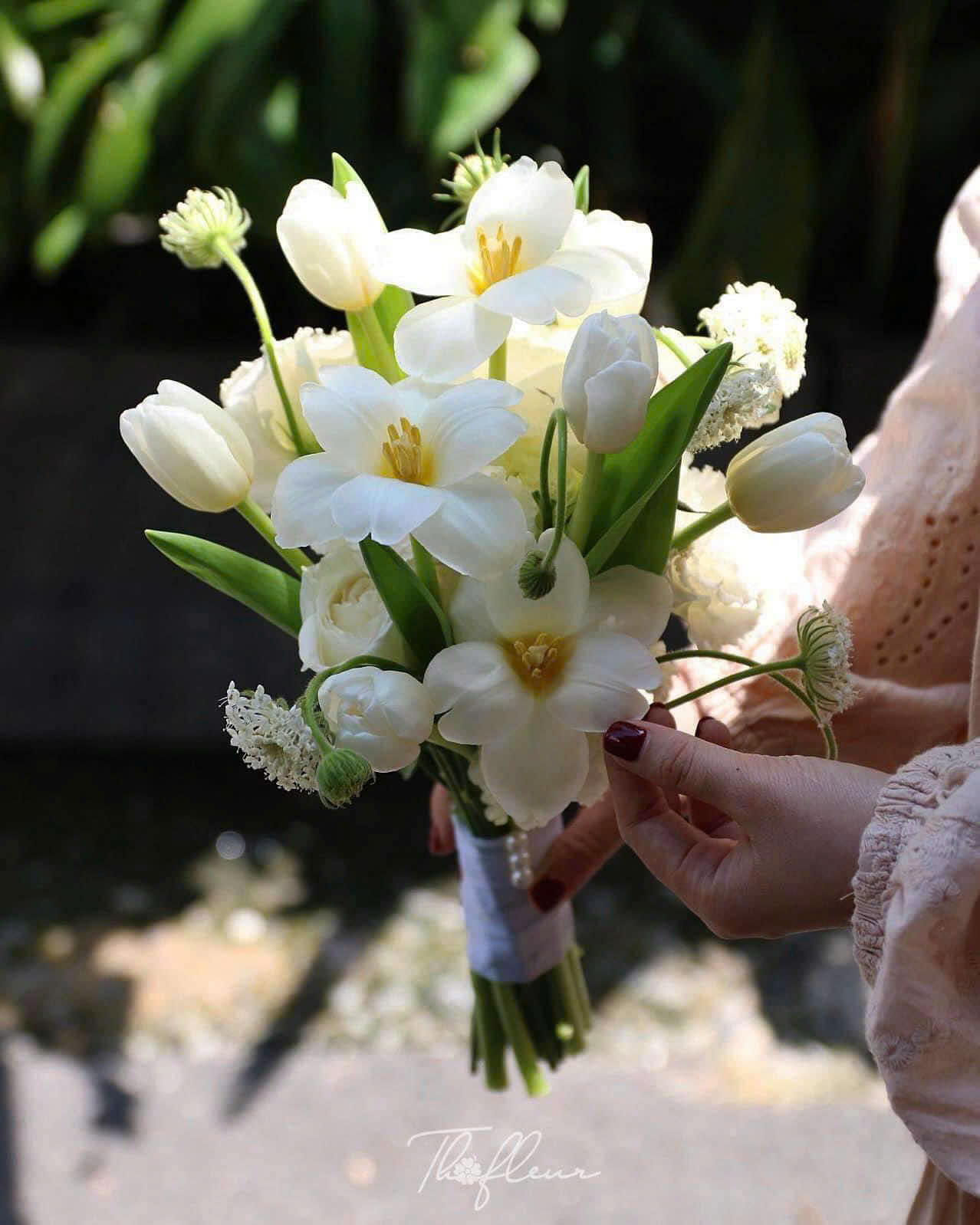 Bó hoa tulip trắng cầm tay làm nổi bật lên vẻ đẹp dịu dàng, thanh thoát, hoàn hảo cho mọi kiểu dáng váy cưới. Với màu trắng tinh khiết, những bông hoa này giúp tôn lên khí chất trong sáng và kiêu sa của cô dâu, khiến nàng luôn rạng ngời trong ngày lễ trọng đại.