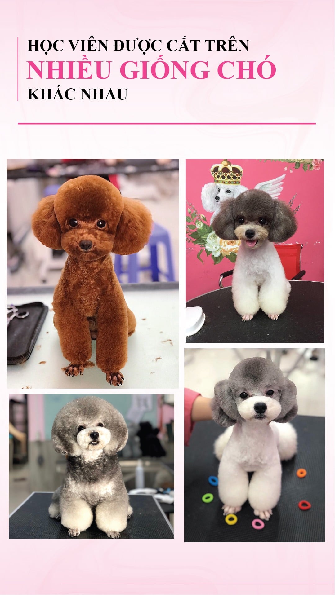 Họ dạy từ cơ bản đến nâng cao, với giảng viên “xịn sò” như Đào Thu Hiền – quán quân thi quốc tế, hay Master Thùy Linh Nguyễn từng dẫn dắt học trò đoạt giải khắp châu Á. Bạn sẽ được cầm tay chỉ việc, thực hành 90% trên chó thật nhiều giống, từ cắt tỉa vệ sinh đến tạo kiểu thẩm mỹ, nhuộm lông siêu đẹp.