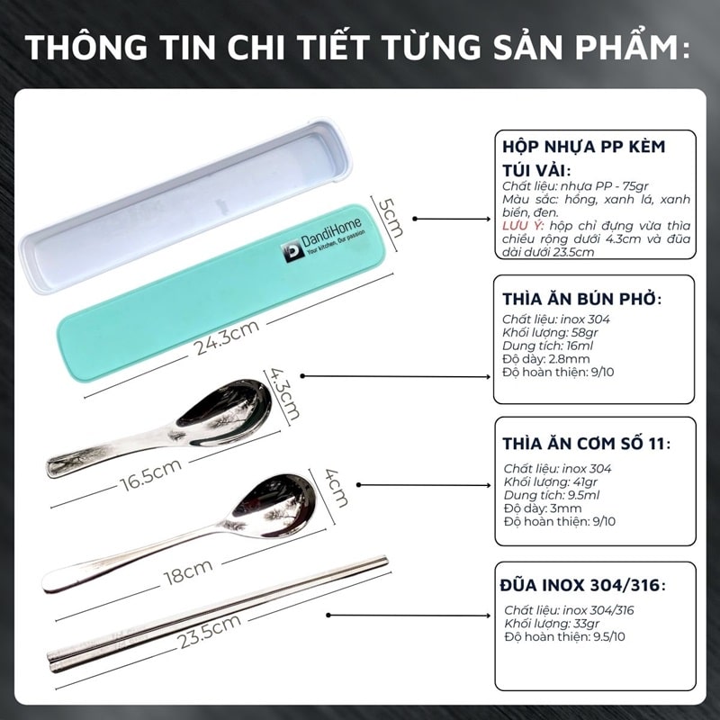 Nổi bật trong số đó là các bộ sản phẩm gồm thìa bún phở, đũa inox chất lượng cao và hộp đựng. Chẳng hạn, bạn có thể tìm thấy hộp đựng 2 đôi đũa có kích thước rất vừa phải, hay hộp đựng 5 đôi đũa với không gian thoải mái hơn cho những bữa tiệc lớn. Một số sản phẩm còn được thiết kế với ngăn hứng nước, đảm bảo vệ sinh cho muỗng và đũa.