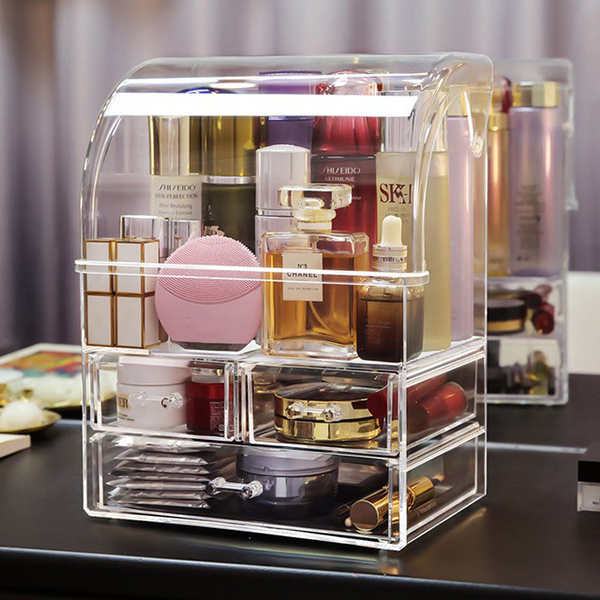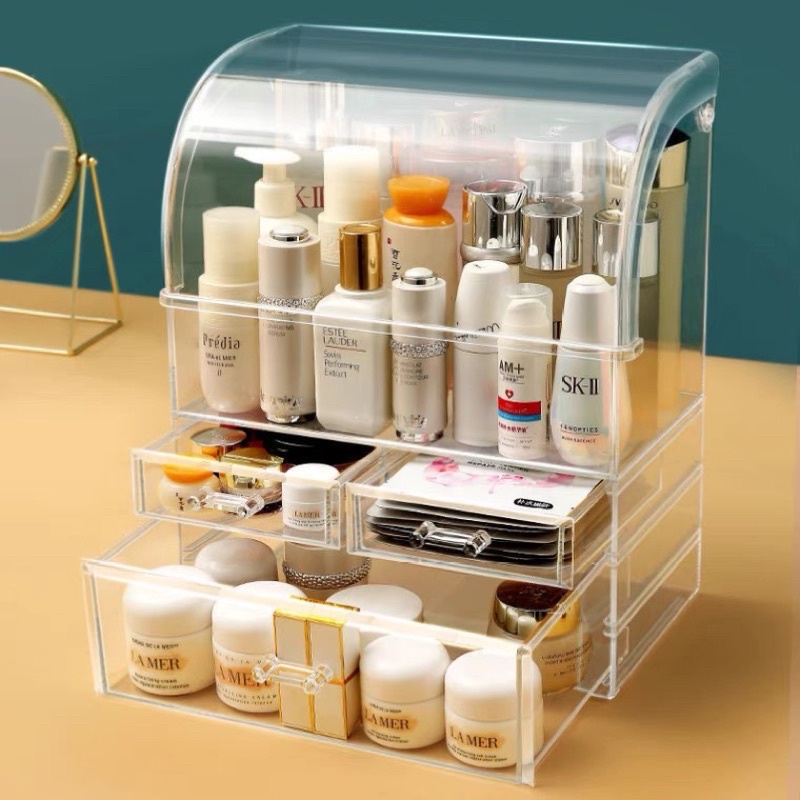 Đặc biệt, sản phẩm được làm từ nhựa acrylic (mica) trong suốt, giúp bạn dễ dàng nhìn thấy bên trong mà vẫn đảm bảo tính thẩm mỹ. Hộp có cấu trúc 03 tầng, bao gồm một nắp mở và hai ngăn kéo bên dưới, giúp phân chia và sắp xếp mỹ phẩm một cách hợp lý. Thiết kế này cực kỳ phù hợp cho những ai yêu thích sự ngăn nắp và dễ tìm kiếm.