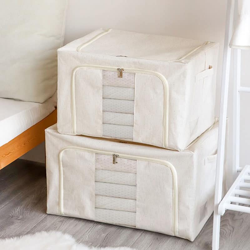 Chất liệu hộp rất đáng chú ý, kết hợp giữa polyester và cotton, mang lại độ mềm mại, bền chắc và chống nhăn hiệu quả. Khung thép dày dặn giúp hộp giữ hình dạng, không bị móp và đảm bảo an toàn cho mọi vật dụng bên trong. Bạn có thể yên tâm lưu trữ đồ dùng trong thời gian dài mà vẫn giữ được sự tươi mới.