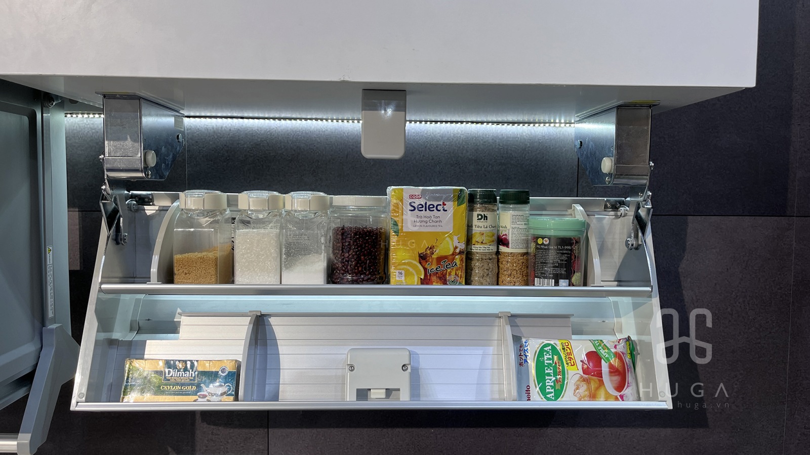 Với thiết kế thông minh, bộ 4 hũ đựng gia vị đi kèm với khay giúp bạn dễ dàng sắp xếp muối, hạt nêm, đường hay tiêu. Kệ treo dưới tủ là nơi lý tưởng cho các lọ gia vị, giúp bạn dễ dàng lấy ra khi cần mà không tốn thời gian tìm kiếm.