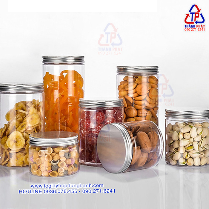 Chất liệu nhựa PET không chỉ bền chắc mà còn an toàn cho sức khỏe, thích hợp để đựng nhiều loại thực phẩm như khô gà, bánh mứt hay trái cây sấy. Hơn nữa, bạn có thể chọn màu nắp theo sở thích, mang đến sự độc đáo cho sản phẩm của mình.