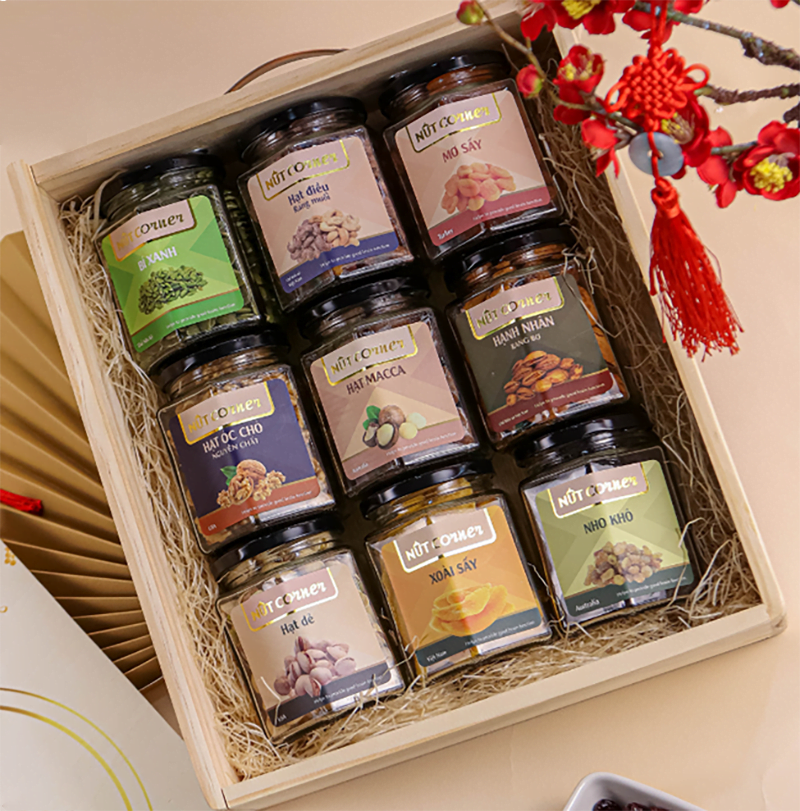 Nut Corner cũng nhận thiết kế theo yêu cầu, giúp doanh nghiệp dễ dàng gửi tặng món quà tinh tế và đẳng cấp, mang lại những lời chúc tốt đẹp cho mùa xuân mới đầy hạnh phúc và thịnh vượng.