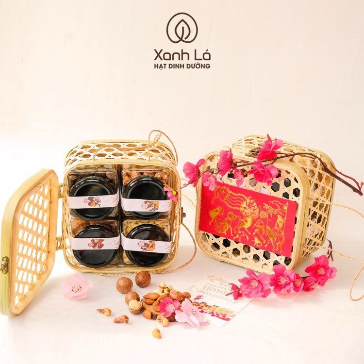 Bên cạnh hạt dinh dưỡng, hộp quà còn được trang trí tinh tế với thiệp chúc mừng và sách “Chuyện Trà”, tạo thêm phần ý nghĩa cho món quà. Các thiết kế hộp từ mây tre, giấy hoặc gỗ không chỉ đẹp mắt mà còn thể hiện sự trân trọng với văn hóa truyền thống trong ngày Tết.