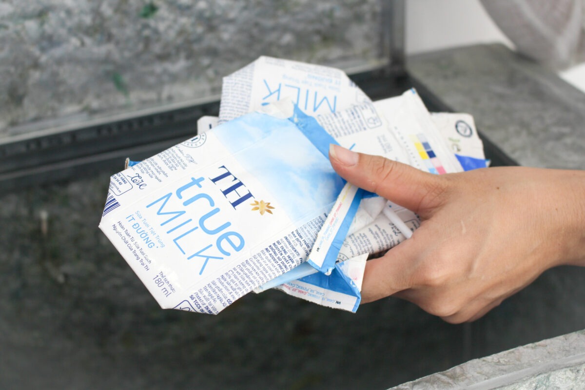 Việc bóp dẹp vỏ hộp sữa trước khi vứt không chỉ tiết kiệm diện tích mà còn giúp quá trình tái chế dễ dàng hơn. Tuy nhiên, đừng quên rằng lượng bột giấy trong vỏ hộp chiếm đến 75% và có thể được tái chế nhiều lần. Vậy nên, đừng ngại làm sạch và gập phẳng vỏ hộp trước khi gửi đi.