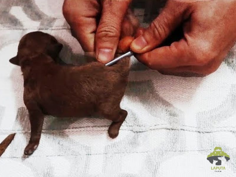 Trước tiên, giữ bé cố định nhẹ nhàng, chọn vị trí cắt ở 1/3, 1/2 hoặc 2/3 đuôi, sao cho sau này đuôi nằm ngang lưng khi trưởng thành. Buộc dây garô phía trên để cầm máu, rồi dùng kẹp kẹp chặt và xoay nhẹ đến khi phần đuôi tự rụng. Lau sạch vết cắt bằng thuốc sát khuẩn ngay lập tức để tránh viêm nhiễm.