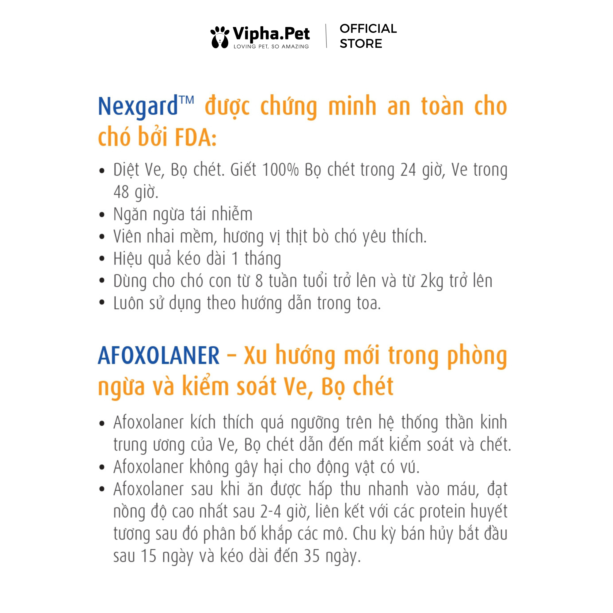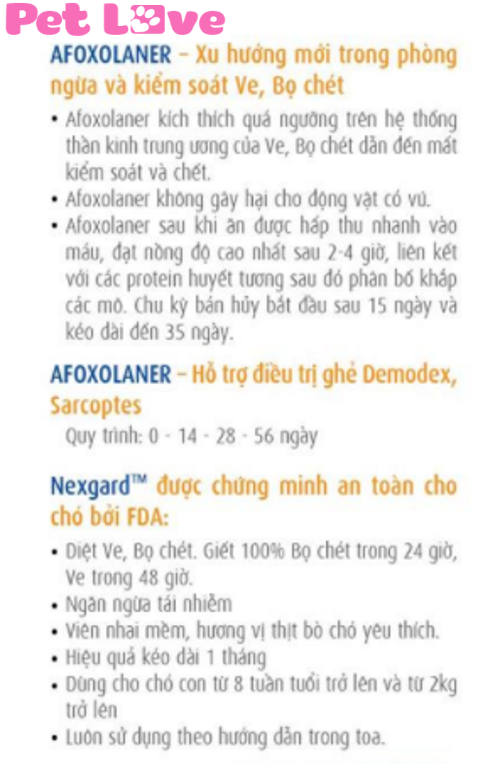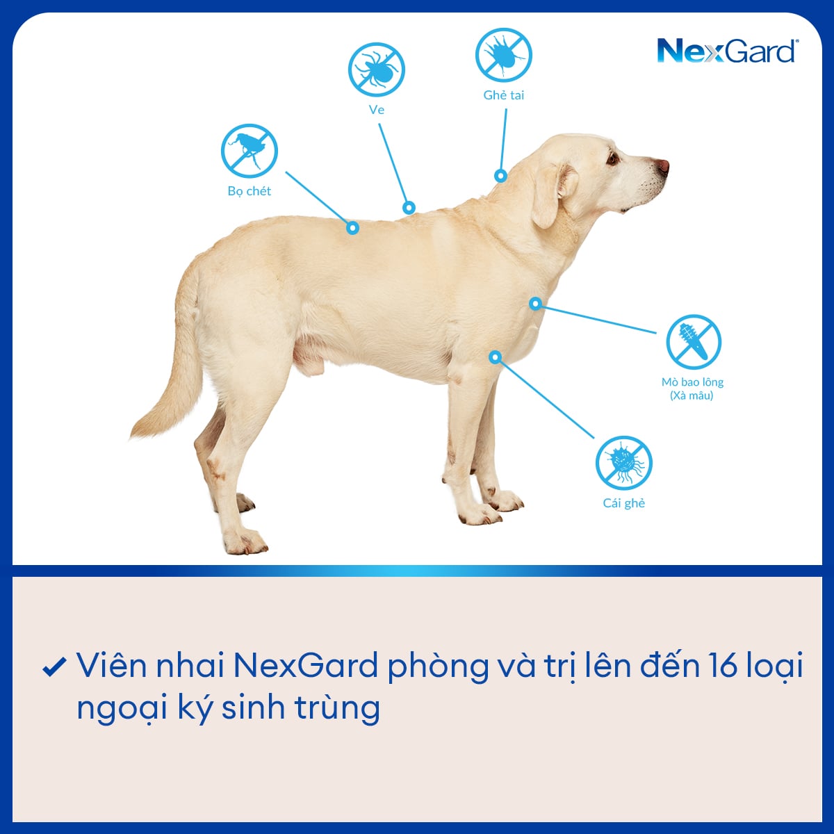 NexGard là viên nhai siêu tiện lợi để trị ve, rận, bọ chét và ghẻ cho chó cưng nhà mình đấy. Thuốc an toàn, hiệu quả kéo dài 30 ngày, chó thích vì vị ngon như thịt bò.