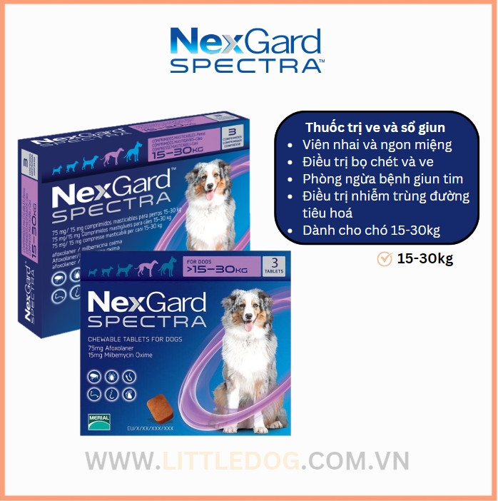 Với Nexgard Spectra (có thêm milbemycin oxime trị giun), liều tương tự nhưng chia size nhỏ hơn, như 2-3,5kg dùng 1 viên 9,375mg afoxolaner. Dùng 1 viên/con/tháng, đặc biệt mùa ve bọ chét.