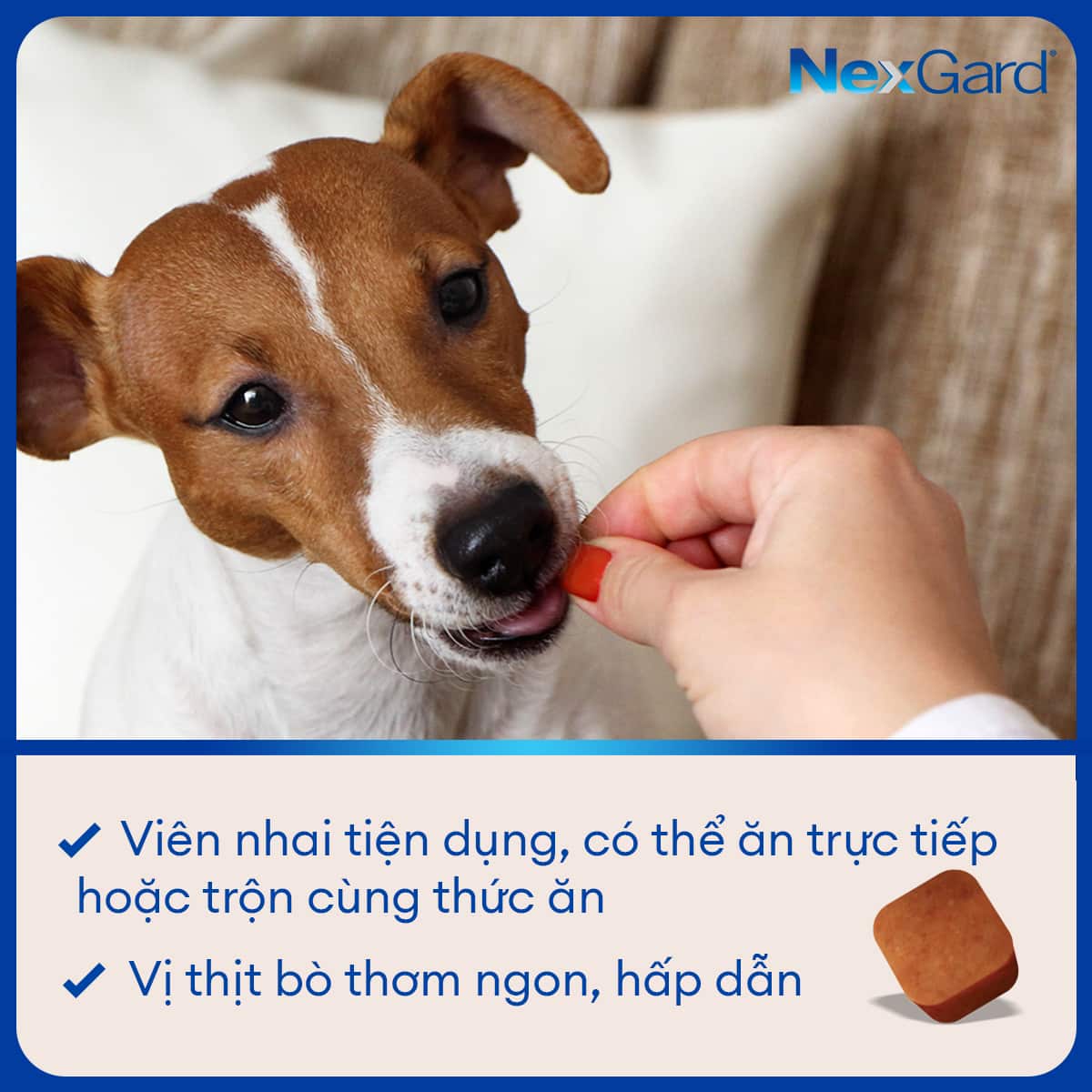 Nexgard là viên nhai ngon miệng vị thịt bò, dành riêng cho chó từ 8 tuần tuổi trở lên, nặng ít nhất 2kg. Bạn nên dùng ngay khi phát hiện ve, bọ chét trên lông chó, vì thuốc diệt bọ chét chỉ trong 4 giờ, đạt 99% sau 8 giờ và ve trong 48 giờ. Đặc biệt hữu ích nếu chó hay chạy nhảy ngoài trời, nơi ký sinh trùng ẩn náu nhiều.